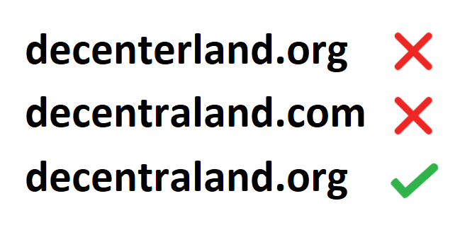 ALWAYS verify that the decentraland.org URL is correct before taking any action on a website.