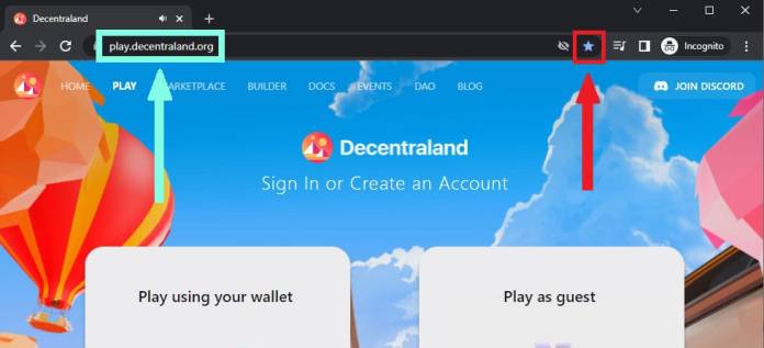- In addition to confirming that the URL is correct, you can make your verification process easier by bookmarking any Decentraland pages you access frequently, such as the launch page. If you’re on a page that you think may be impersonating a Decentraland page (one that you had previously bookmarked), you can check to see if the bookmark star in the right corner of your search bar is highlighted, indicating if you’re on the real Decentraland page, as seen below.